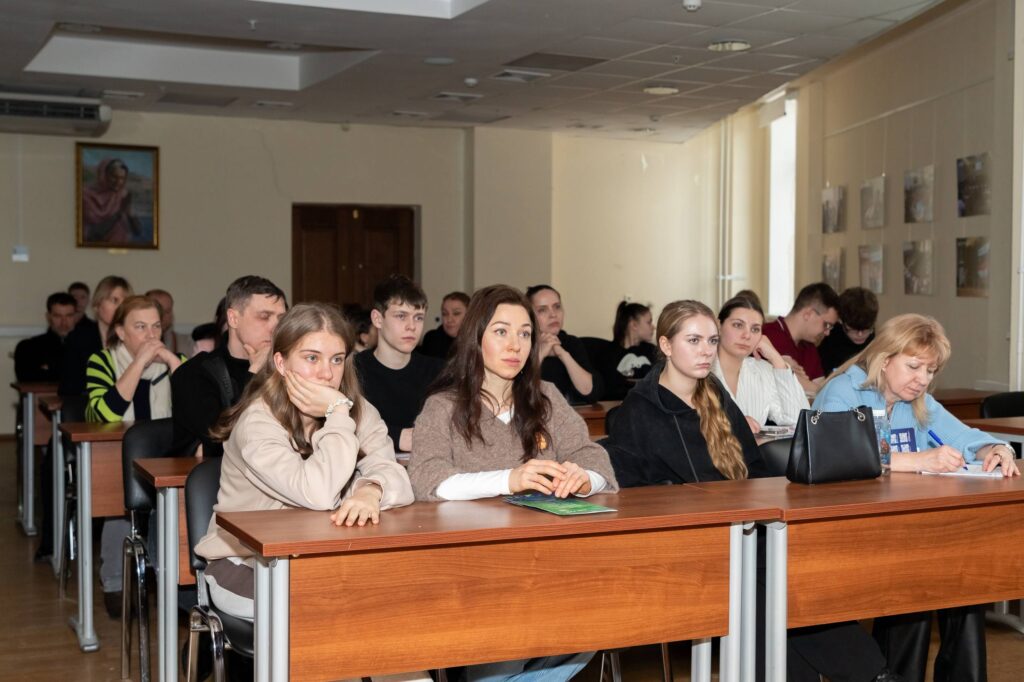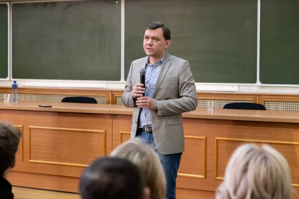 Продолжил выступление заместитель декана по учебной работе Максим Фоменко. Он подробно осветил направления подготовки, рассказал об учебном процессе и важных аспектах приемной кампании 2026 года.
